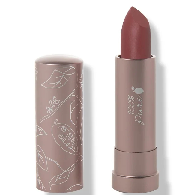 100% Pure Cocoa Butter Matte Lipstick es una barra de labios mate formulada con pigmentos de frutas saludables y una mezcla nutritiva de manteca de cacao, manteca de karité y vitamina E para hidratar mientras que proporciona un color intensamente rico.