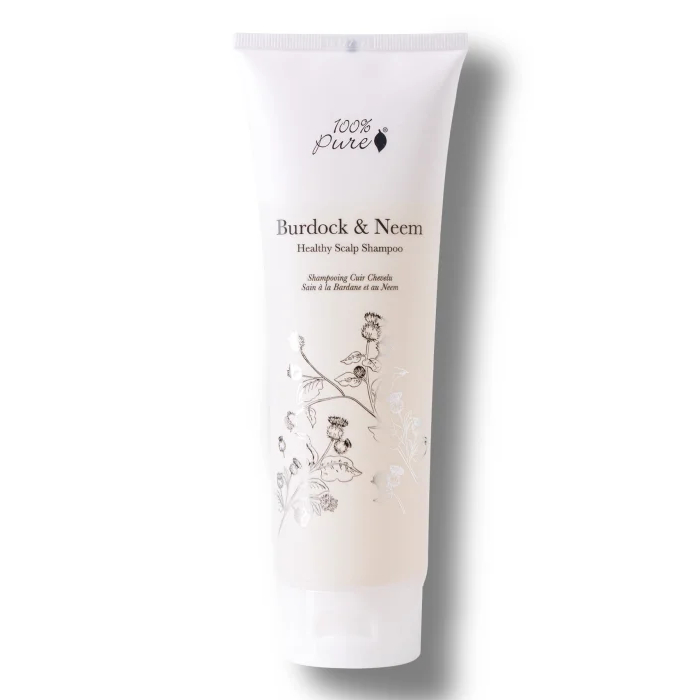 100% Pure Burdock & Neem Healthy Scalp Shampoo es un champú natural con una fórmula purificante que destapa los poros, estimula la circulación y alivia la sequedad, la picazón y la descamación. Con hidratación añadida para un cuero cabelludo y cabello más saludables.