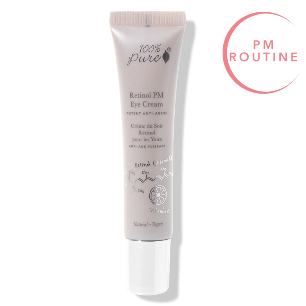 100% Pure Retinol PM Eye Cream es un concetrado potente e hidratante de vitaminas antienvejecimiento, células madre y péptidos que promueven la producción de colágeno, la elasticidad y disminuyen la apariencia de las arrugas en el contorno de los ojos.