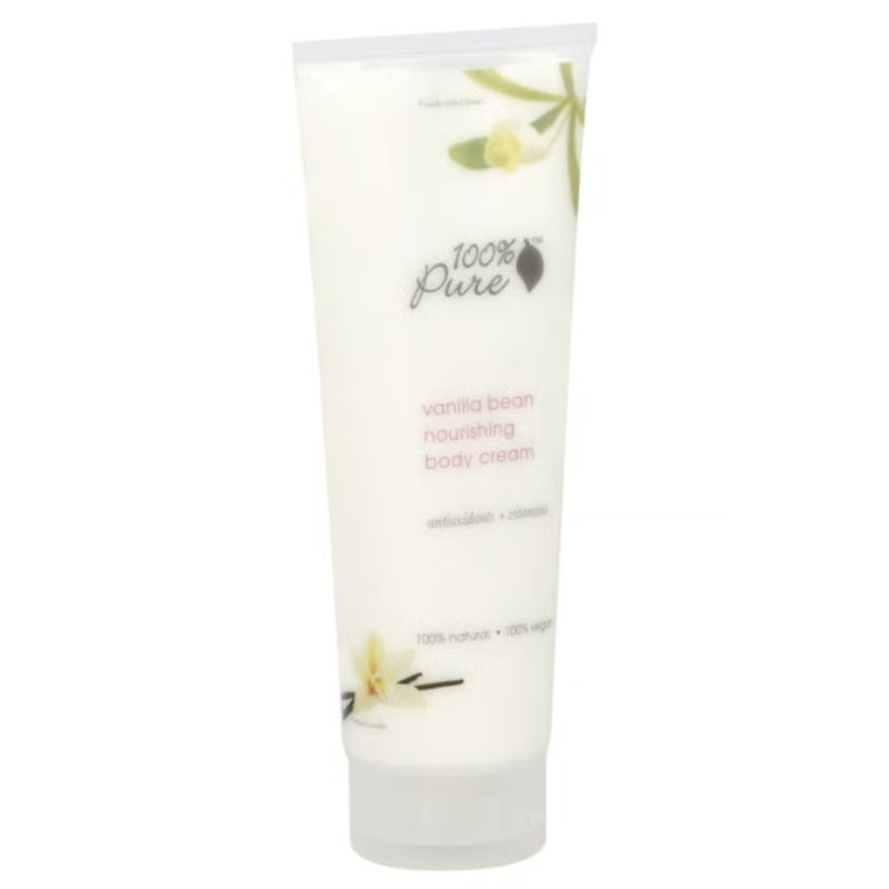 100% Pure Vanilla Bean Nourishing Body Cream es una crema altamente nutritiva y lujosa concentrada con potentes antioxidantes antienvejecimiento, vitaminas, aceites de frutas que suavizan la piel, y mantecas hidratantes de cacao y de aguacate. Crema corporal con un aroma delicioso que inmediatamente hidratará, suavizará y nutrirá tu piel para una tez saludable y brillante.