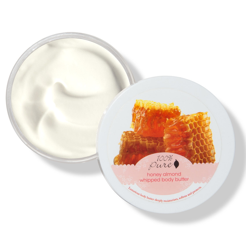 100% Pure Honey Almond Whipped Body Butter es una lujosa manteca corporal que hidrata, suaviza y protege profundamente.