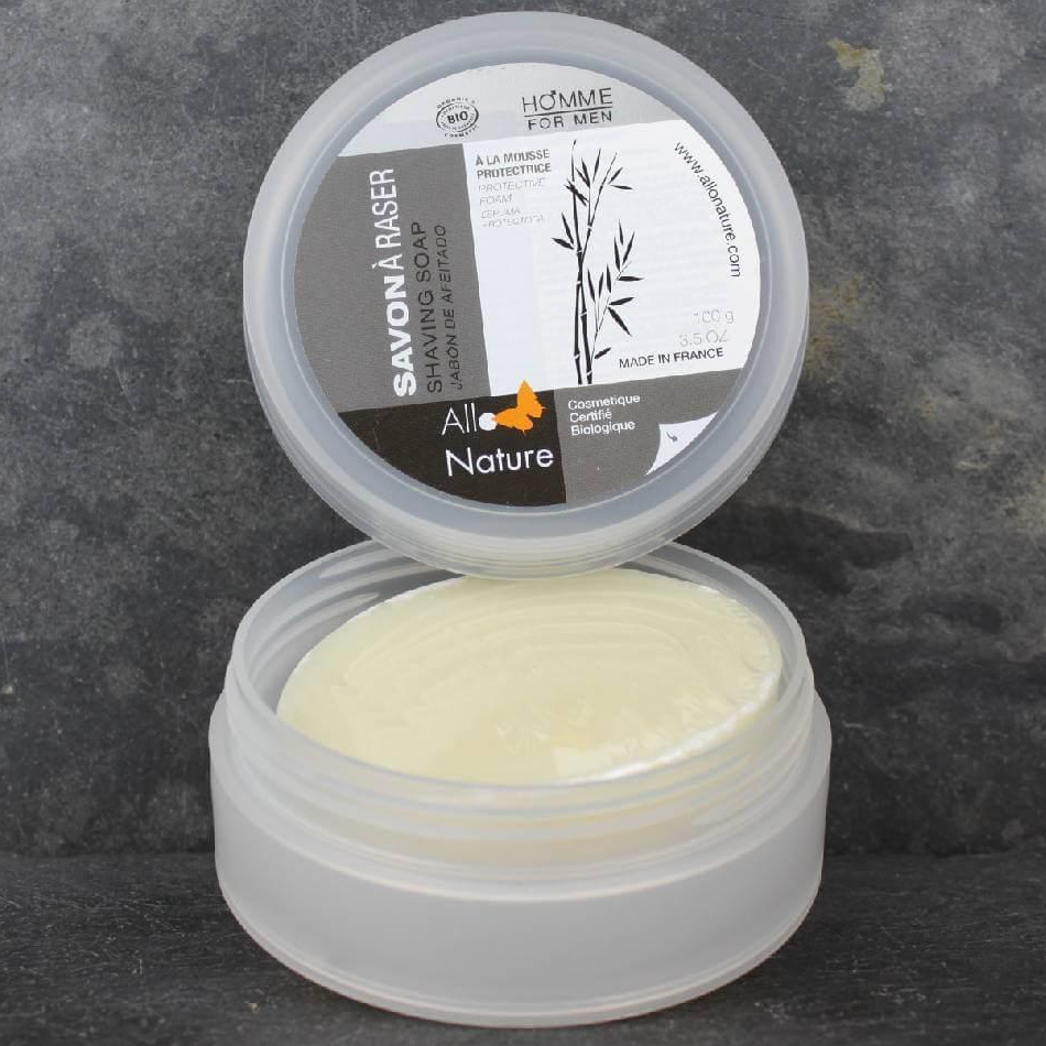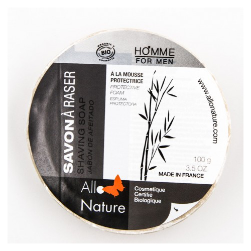 El jabón de afeitado Allo’Nature asocia una multitud de aceites tratantes y suavizantes para la piel.
