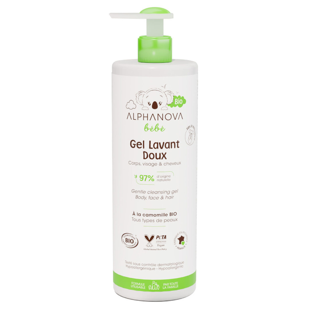 El gel de baño suave Alphanova Bébé® tiene una fórmula ultra suave con extracto de Manzanilla y Aloe Vera.