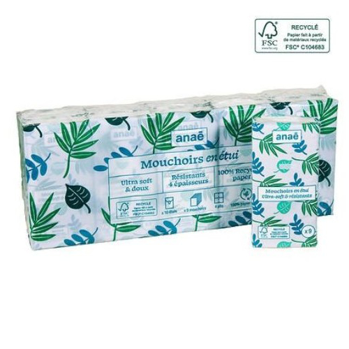 Los pañuelos desechables Anaé, envueltos en estuches de 9 unidades, están hechos con fibras 100 % recicladas y con certificación FSC.