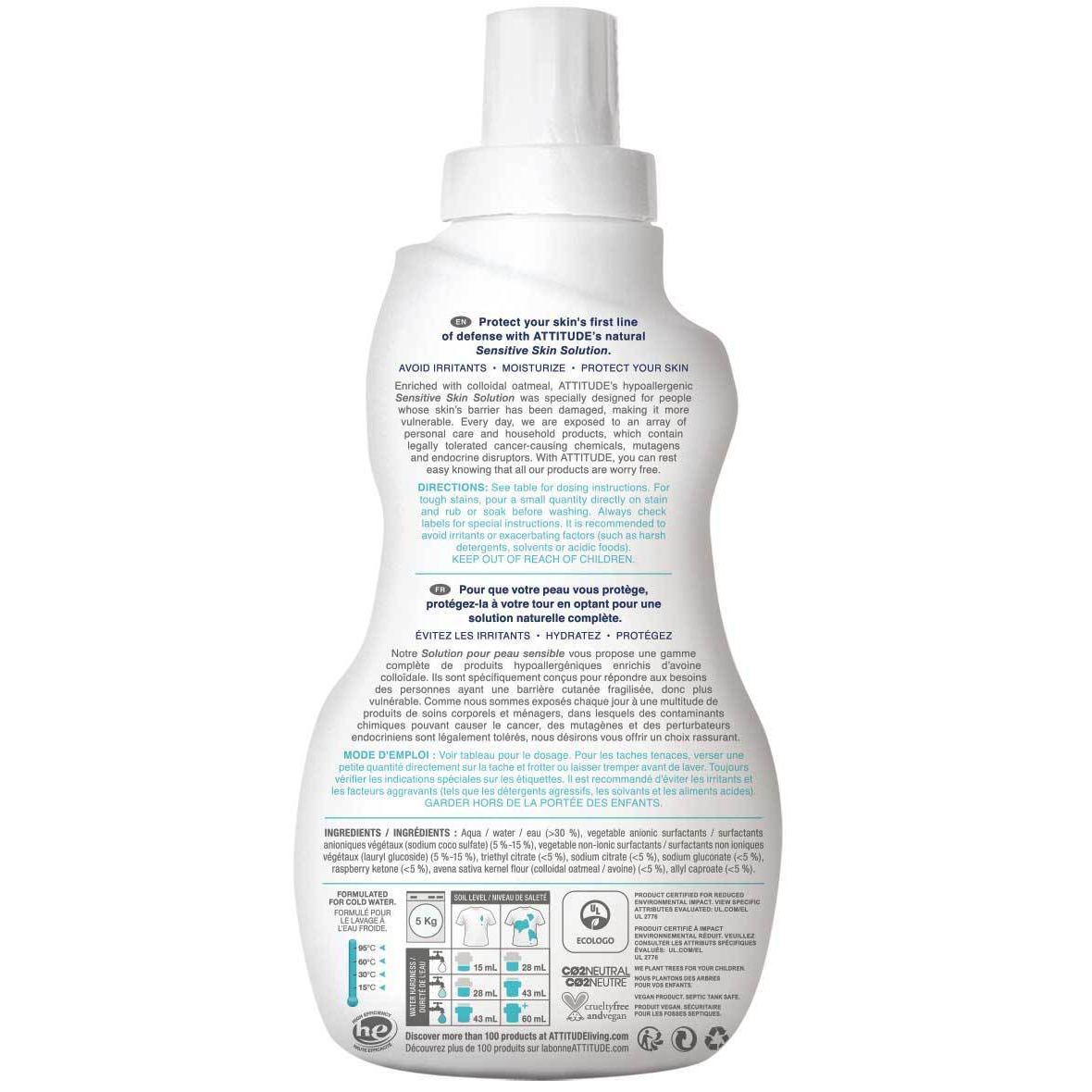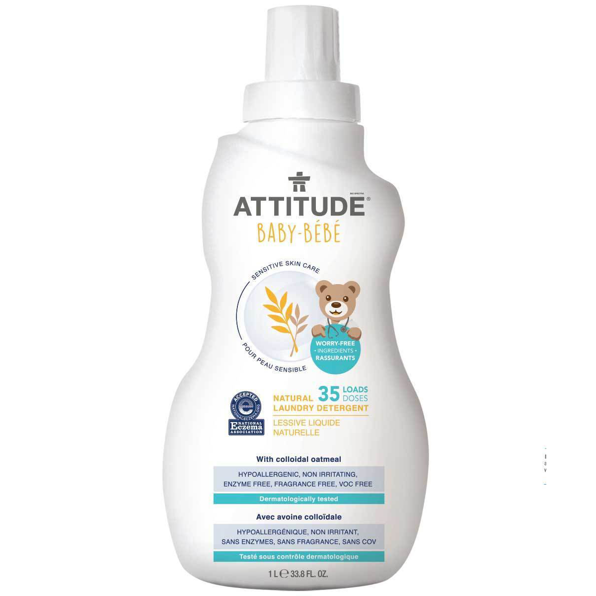 La mayoría de los detergentes para ropa contienen enzimas. Básicamente, ¡están digiriendo la suciedad de las telas! Desafortunadamente, estas enzimas también pueden irritar la piel fina y delicada de tu bebé. El detergente para ropa natural Baby Skin Sensitive de ATTITUDE utiliza ingredientes hipoalergénicos sin perfume que son tan suaves con las fibras sintéticas y naturales como lo son con la piel de tu pequeño. Para estar seguros, ¡lo hemos probado dermatológicamente y está certificado por la Asociación Nacional de Eczema! Nuestra fórmula libre de enzimas funciona con lavadoras estándar y HE, así como con ciclos de agua fría.