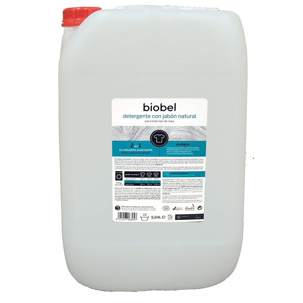 El detergente líquido ecológico Biobel es un potente detergente líquido para lavadora para todo tipo de ropa con aceite esencial de Lavanda, que deja un agradable y duradero aroma natural en toda la colada. Es eficaz incluso a bajas temperaturas.