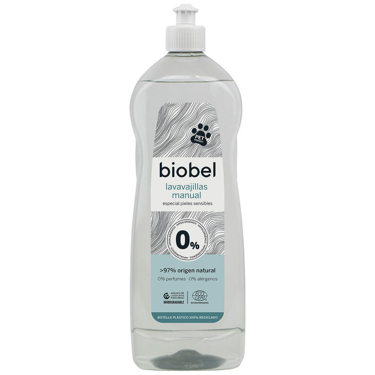 El lavavajillas manual 0 % especial pieles sensibles Biobel es un eficaz lavavajillas manual: limpia, desengrasa y abrillanta. Para todo tipo de utensilios de cocina. Con ingredientes de origen 100 % vegetal. Sin elementos petroquímicos ni de origen animal. Está formulado son perfumes ni alérgenos y es muy suave para la piel. Cuida y protege las manos más delicadas. Respeta el medio ambiente.