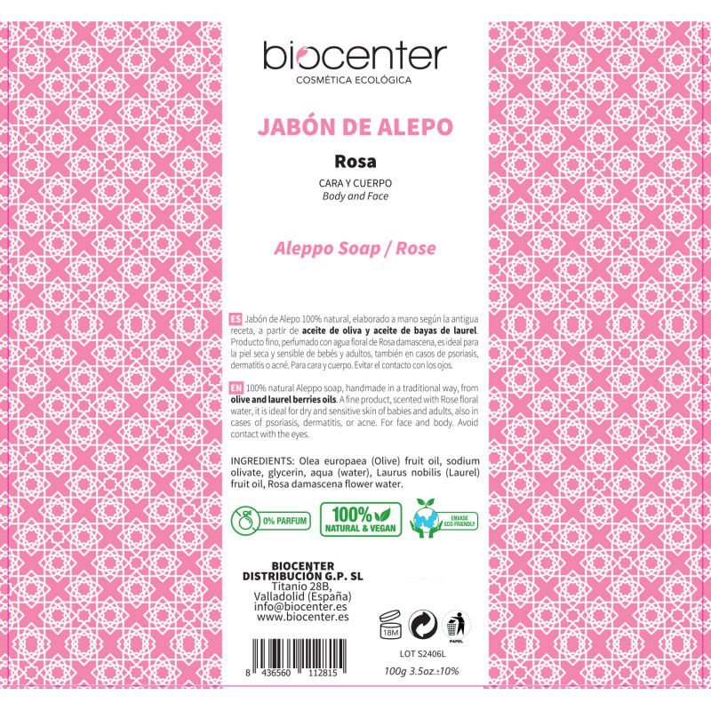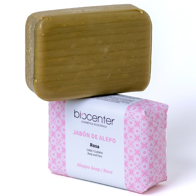 Jabón de Alepo 100 % natural, elaborado a mano según la antigua receta, a partir únicamente de aceite de oliva, aceite de bayas de laurel y agua floral de Rosa Damascena.