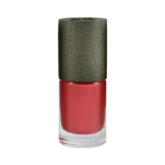 La botella de esmalte de uñas está hecha de vidrio y el tapón está hecho de madera etiquetada PEFC, de bosques manejados de manera sostenible.