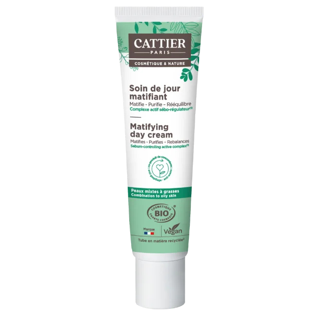 La crema de día matificante orgánica Cattier regula el exceso de sebo para un acabado mate inmediato y duradero. Enriquecida con un complejo activo seborregulador rico en micronutrientes, un coproducto de pepino y aceite de jojoba orgánico, equilibra el microbioma cutáneo, controla el brillo de forma duradera, purifica y mejora la tez sin resecar. Con un 75 % de ingredientes orgánicos, su fórmula natural protege el equilibrio natural de la piel.