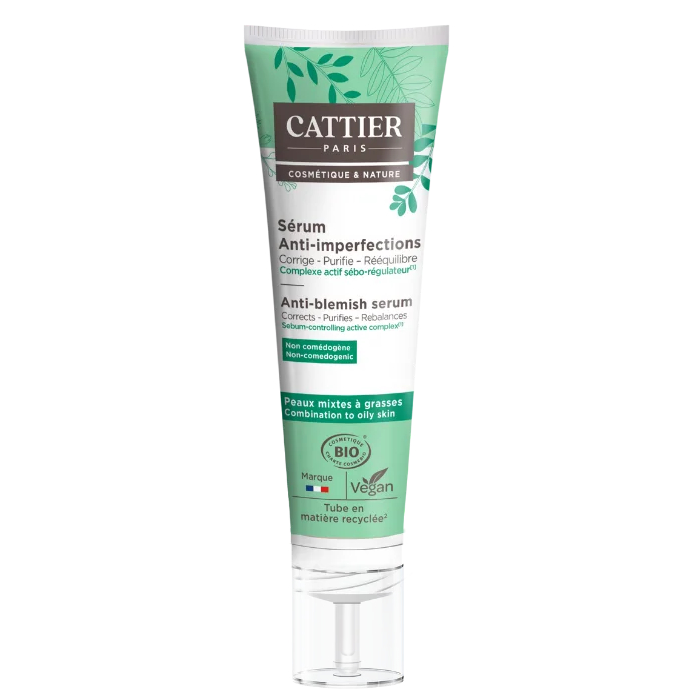 Este sérum orgánico antiimperfecciones de Cattier combina eficacia y suavidad para prevenir y corregir todo tipo de imperfecciones. Ultraconcentrado en ingredientes activos, purifica y matifica la piel, siendo ideal para pieles mixtas a grasas. Su complejo activo seborregulador, rico en micronutrientes, reequilibra la microbiota cutánea, mientras que la gluconolactona exfolia suavemente y el bisabolol calma el enrojecimiento. No comedogénico y formulado con un 72 % de ingredientes orgánicos, desobstruye los poros, mejora visiblemente la textura de la piel y limita la aparición de imperfecciones. Un sérum orgánico específico para una tez clara y uniforme.