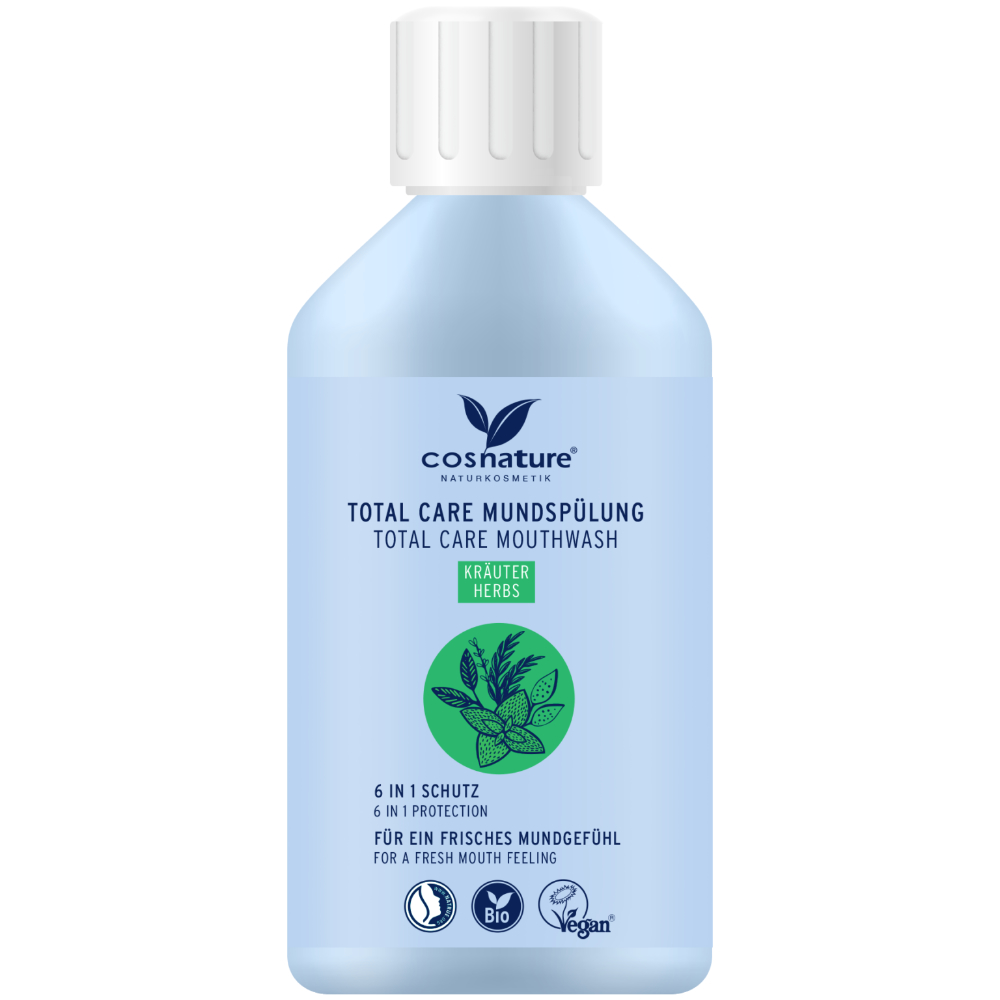 El enjuague bucal herbal Total Care con flúor Cosnature® ofrece una protección integral y combina 6 funciones relevantes en una sola fórmula:
