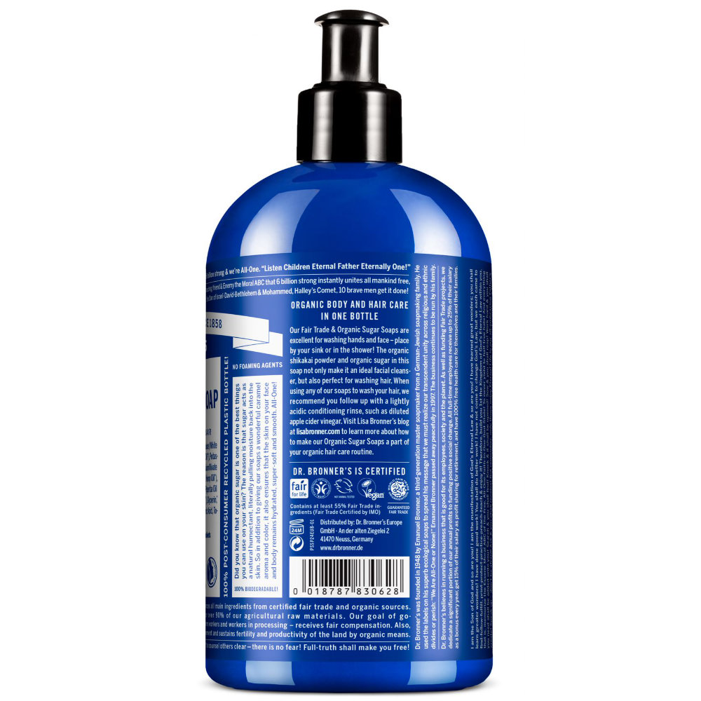 Dr. Bronner's 4-in-1 Sugar Peppermint Organic Pump Soap es dulce para el cuerpo y el planeta. El comercio justo y el azúcar ecológico dan a este jabón un rico color caramelo y un aroma dulce. El Azúcar se combina con el jugo de Uva Blanca ecológica para mantener la piel nutrida, hidratada y suave. Los aceites ecológicos de Coco, Oliva y Cáñamo se mezclan con una cremosa espuma de castilla.