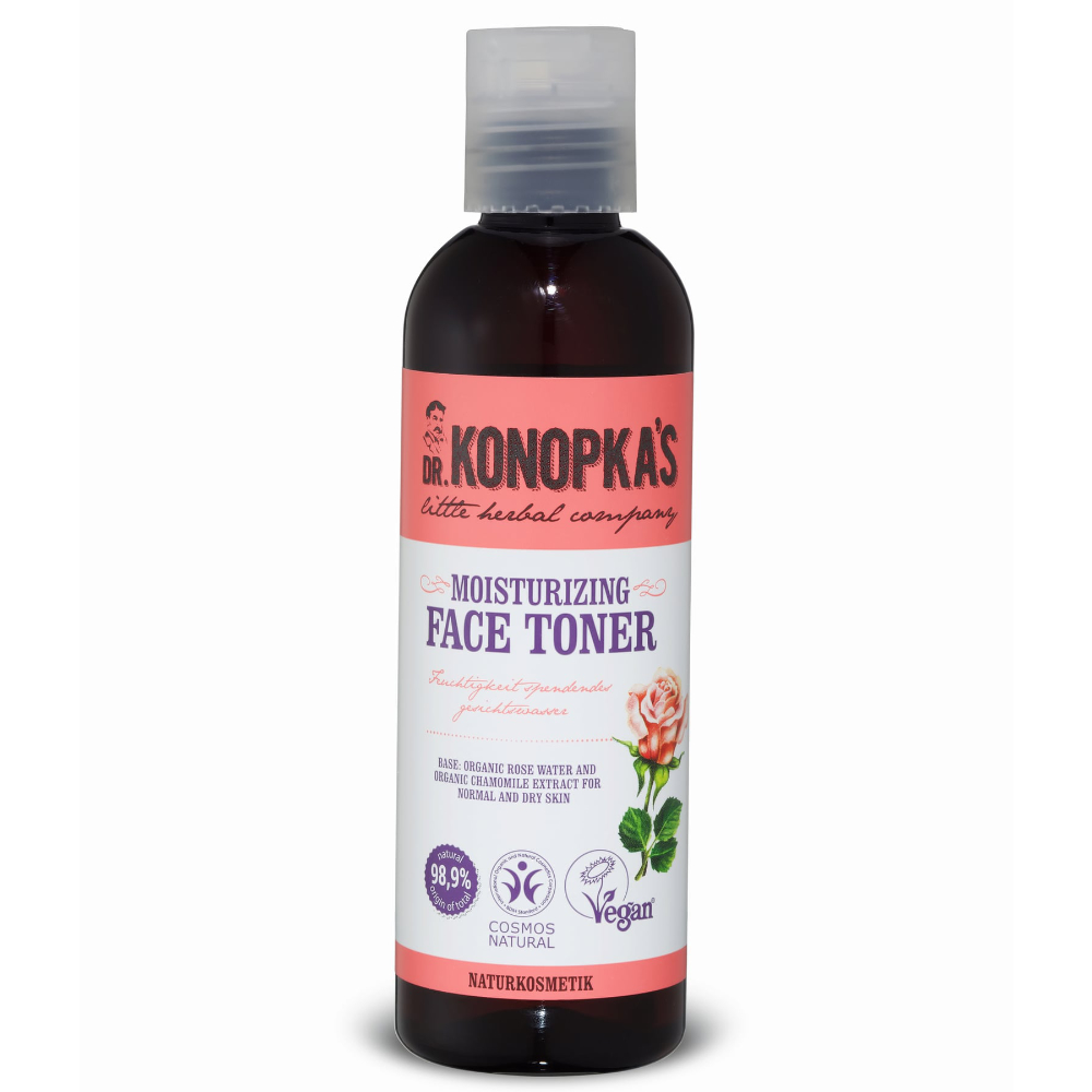 El tónico facial hidratante Dr. Konopka contiene extracto de manzanilla orgánica rica en nutrientes minerales y bisabolol que ayudan a calmar y a suavizar la piel. En combinación con el agua de rosa aporta una delicada limpieza y restaura el nivel natural de hidratación de la piel, dejándola suave y sedosa.