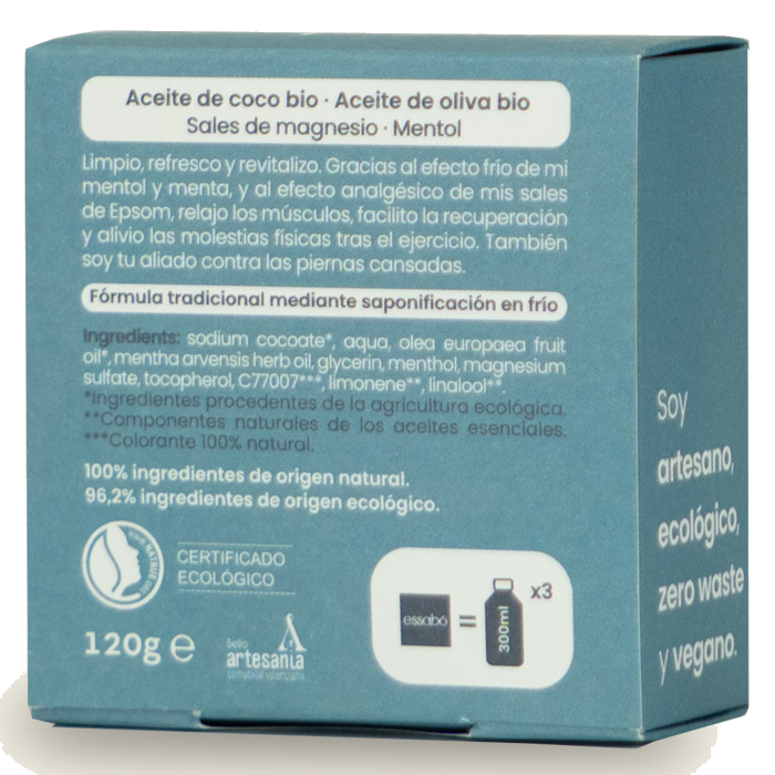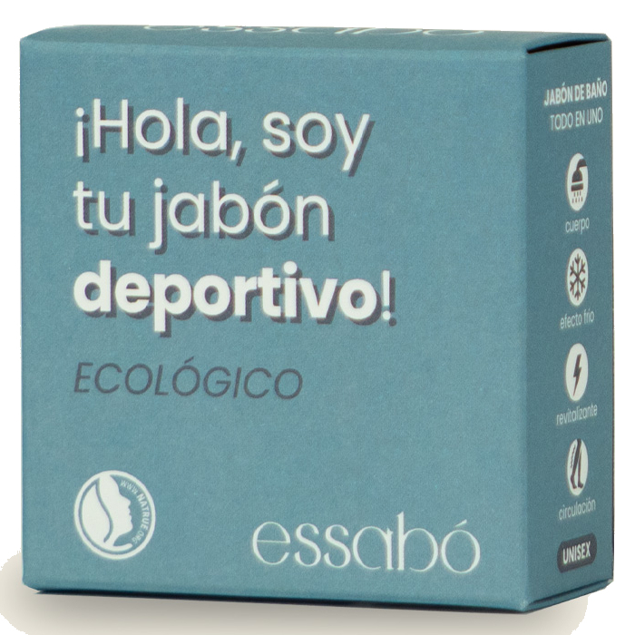 El Jabón Deportivo Essabó es un jabón cosmético de baño que limpia, refresca y ayuda a la recuperación muscular tras el ejercicio. Gracias al efecto frío procedente del mentol y al efecto analgésico de las sales de magnesio, relaja los músculos y alivia las molestias físicas tras el ejercicio.