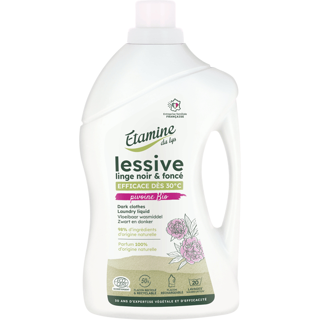 El detergente líquido para ropa oscura y negra Etamine De Lys protege los colores oscuros. El negro permanece negro por más tiempo, la intensidad del color se conserva. Esta fórmula única utiliza agentes limpiadores suaves de origen vegetal y lo convierte en el único detergente ecológico negro certificado como Ecodetergente.