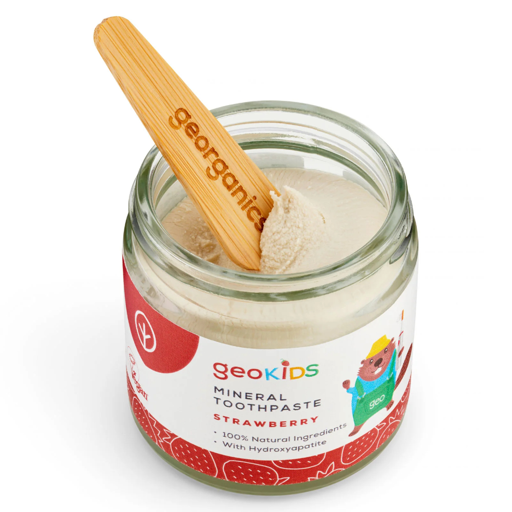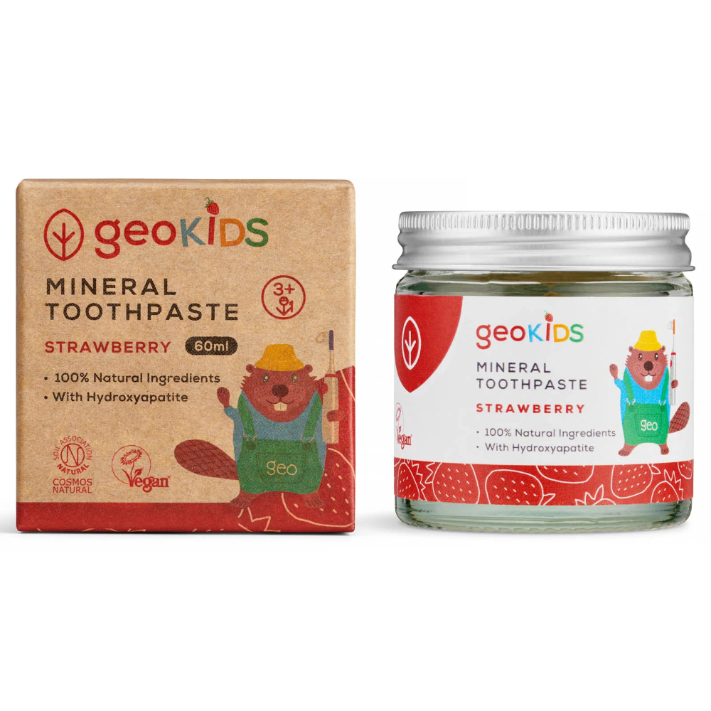 GeoKids Mineral Toothpaste es una pasta de dientes natural no espumosa, diseñada específicamente para los más pequeños. Con un delicioso sabor a fresa natural y vibrantes colores naturales, hace que el cepillado sea divertido y placentero para los niños. Elaborada con esmero, esta pasta dental contiene eritritol, que ayuda a prevenir las caries, e hidroxiapatita, que favorece la remineralización para fortalecer los dientes en desarrollo.
