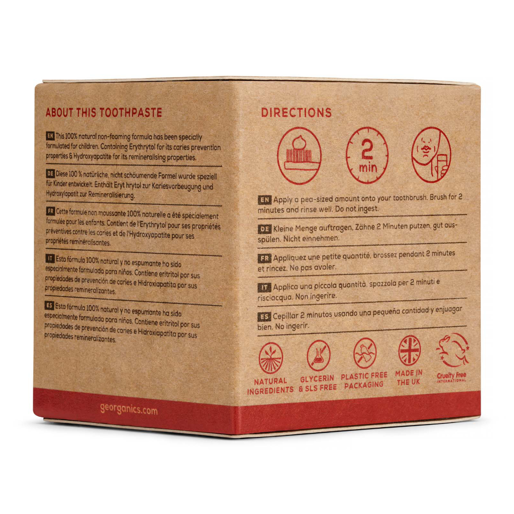 Mejora la rutina de cuidado bucal de tu hij@ con la pasta de dientes sin flúor de fresa de Georganics: la combinación perfecta de ingredientes naturales para una sonrisa divertida, segura y saludable.