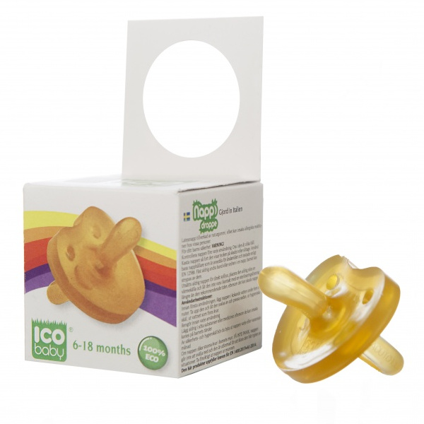 El chupete con forma de gota Ico baby es suave y adaptable y está elaborado con caucho 100% natural, de cultivo ecológico y sostenible.
