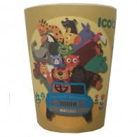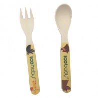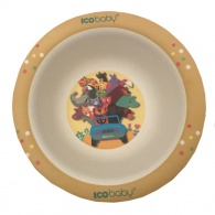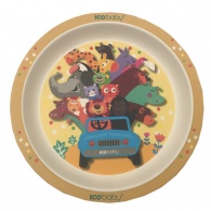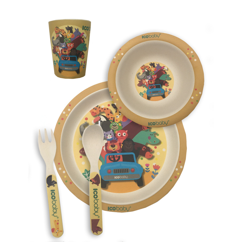 El Set de vajilla de fibra de Bambú estilo "coche" contiene 5 piezas: plato llano, plato hondo, vaso, cuchara, tenedor.