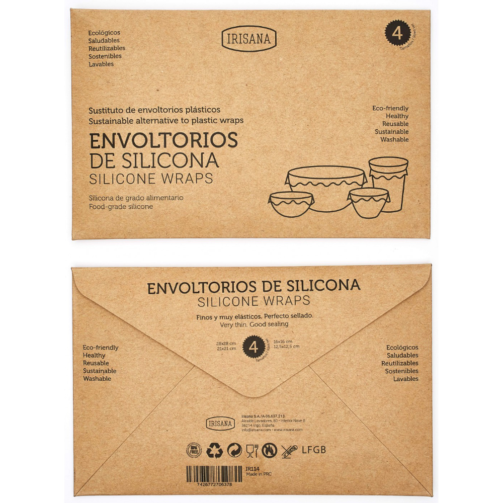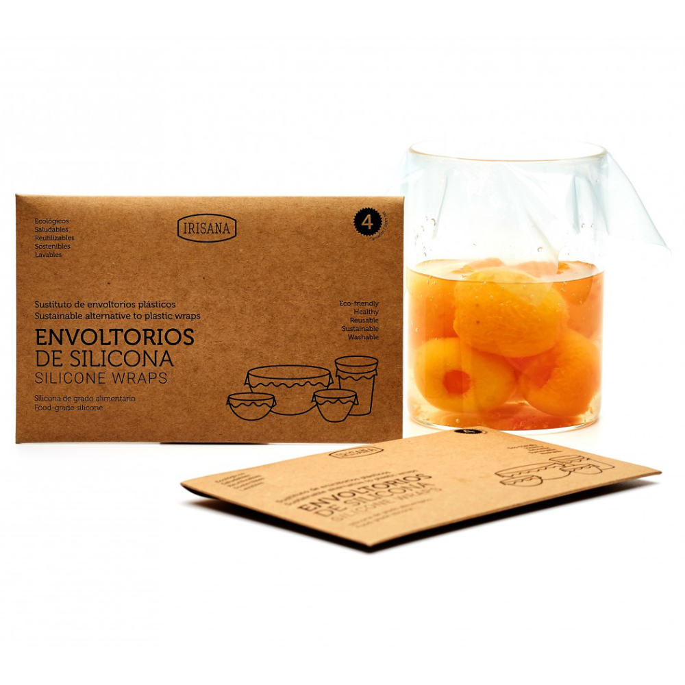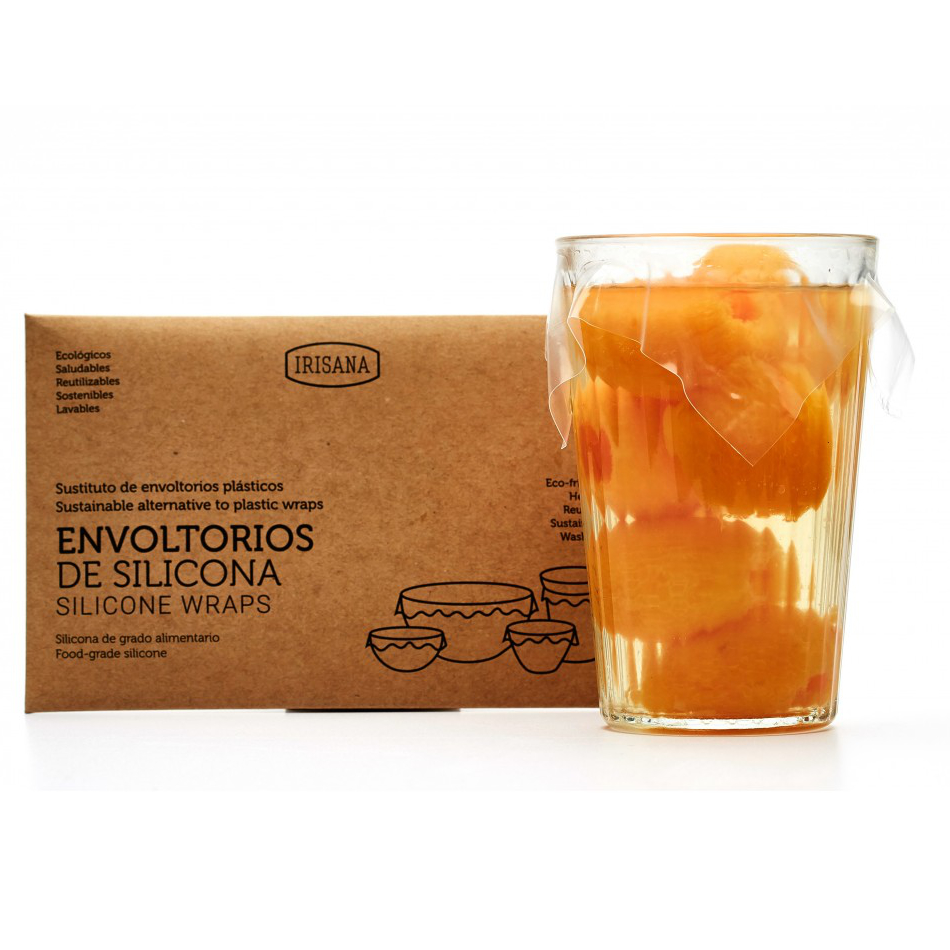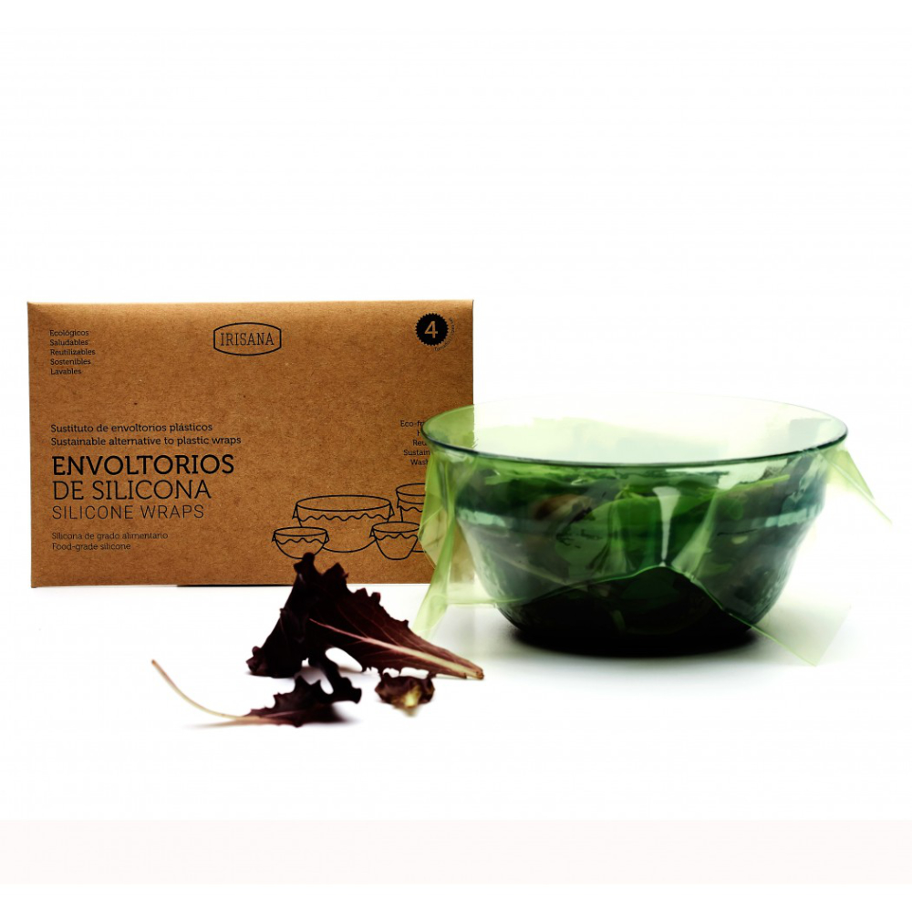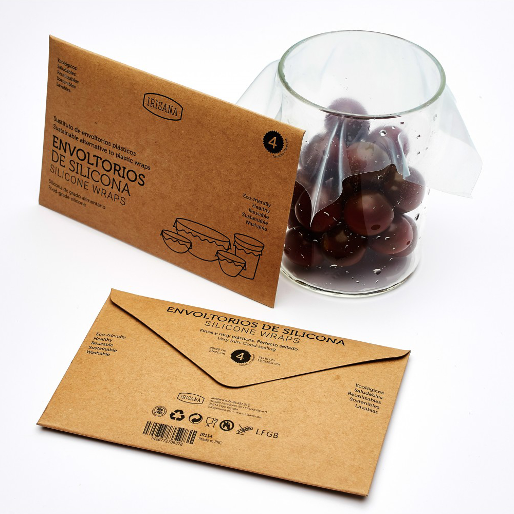 Los envoltorios reutilizables de silicona Irisana son una alternativa al papel film. Permiten cerrar la mayoría de recipientes de forma rápida y segura, ya que son muy suaves y elásticos, evitando posibles fugas.