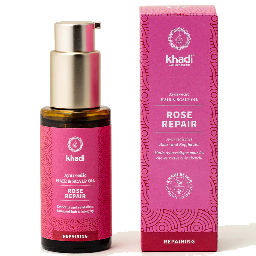 Khadi Ayurvedic Hair Oil Rose Repair: regenerador y reparador, la solución ayurvédica para cabello seco y dañado estructuralmente.