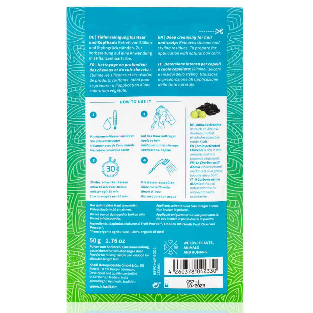 ¡Desintoxica tu cabello! Mascarilla de limpieza profunda para el cabello y el cuero cabelludo con el poderoso carbón activado Amla, el ingrediente secreto del Ayurveda y una novedad absoluta en el mercado. Los residuos de silicona y productos de peinado se atraen, se unen y se lavan como por un imán.