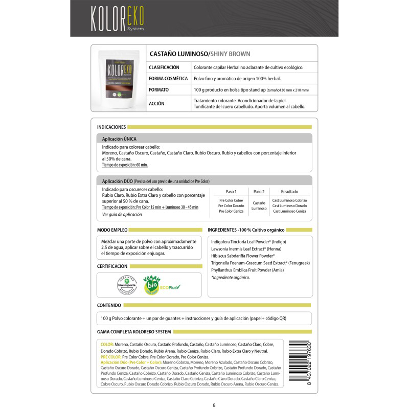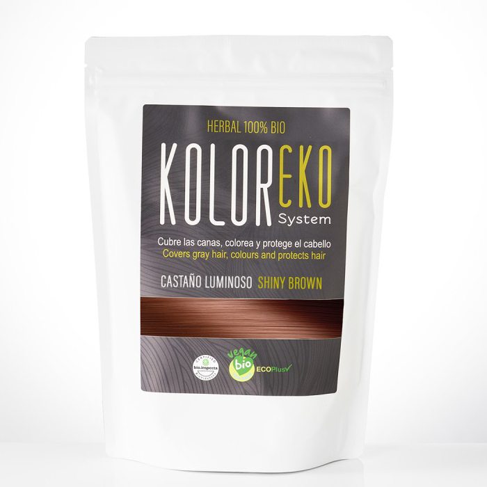 El tinte herbal de aplicación única Koloreko System Castaño Luminoso Shiny Brown es un tinte no aclarante, 100% vegetal y certificado ecológico, apropiado tanto para colorear el cabello como para cubrir las canas de forma eficaz.