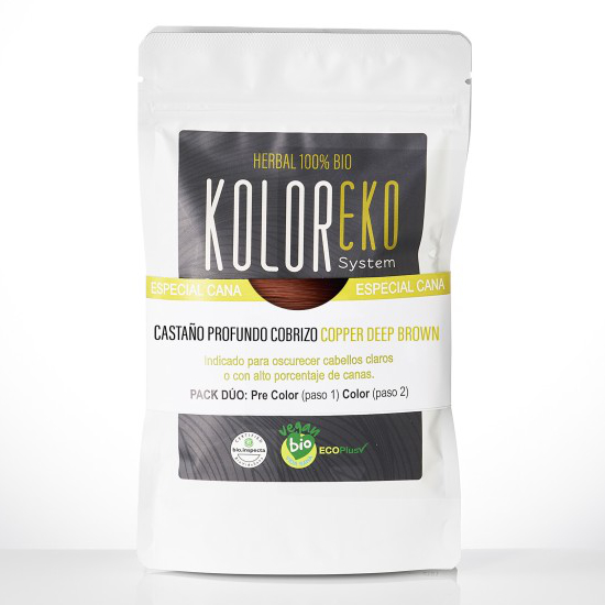 El pack dúo Koloreko System Castaño Profundo Cobrizo es un tinte no aclarante, 100% vegetal y certificado ecológico, especial para la cobertura de las canas.