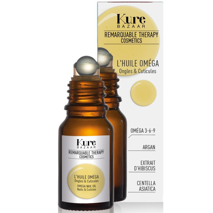 El aceite con Omegas Kure Bazaar Remarquable Therapy Cosmetics es una mezcla única y excepcional de once aceites vegetales nutritivos ricos en omega 3-6-9. Por primera vez, los aceites de argán, avellana y cañamo, conocidos por sus propiedades regeneradoras, antioxidantes, suavizantes y calmantes, se combinan con extractos naturales de hibisco y centella asiática para embellecer las uñas débiles y apagadas.