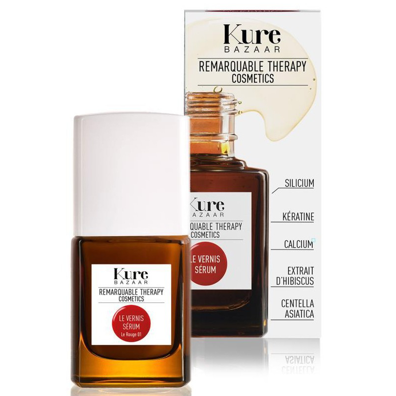 Le Vernis Sérum Le Rouge 01 de la colección de esmaltes de uñas en sérum de Kure Bazaar Remarquable Therapy Cosmetics es un precioso rojo brillante, sin naranja ni rosa; es el rojo ideal para iluminar todos los tonos de piel.