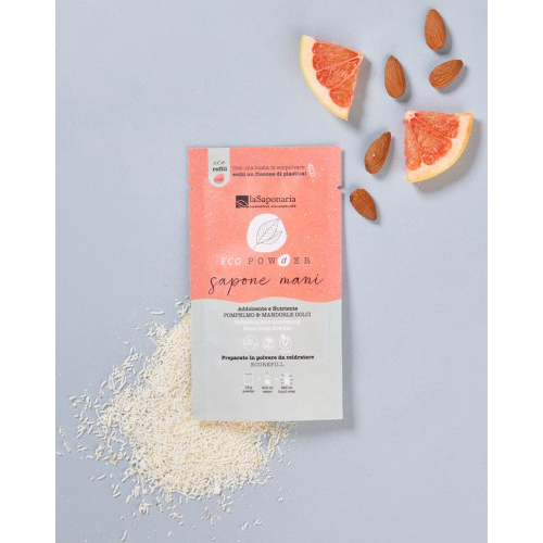 Vierte 200 ml de agua en un frasco - si aún no tienes uno en casa, puedes elegir la botella de aluminio de LaSaponaria - y agrega todo el contenido de la bolsita. Cierra la botella y agita enérgicamente. Desenrosca el tapón para permitir que escape el aire y espera 30 minutos. ¡Tu jabón de manos está listo!
