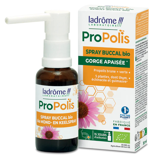 Por su comosición de extractos biológicos de Propóleo, Miel, Salvia, Equinácea y Tomillo, este vaporizador bucal de Ladrôme favorece la desinfección y la protección de la boca y la garganta. Refresca el aliento y mejora la higiene bucal.