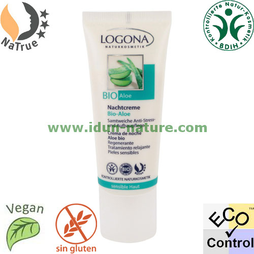 Con la crema de noche con Aloe Vera Bio, las pieles sensibles pueden disfrutar de una tratamiento de belleza relajante. Con valiosos aceites y extractos vegetales de cultivo biológico, como el aceite de Almendras, de Jojoba y Sésamo, la manteca de Karité y el extracto de Aloe Vera, Té Verde y Lirio. Su suave fórmula ejerce un efecto relajante, hidrata la piel, y reduce las arrugas y la tirantez provocadas por la sequedad, estimulando las funciones vitales de la piel.