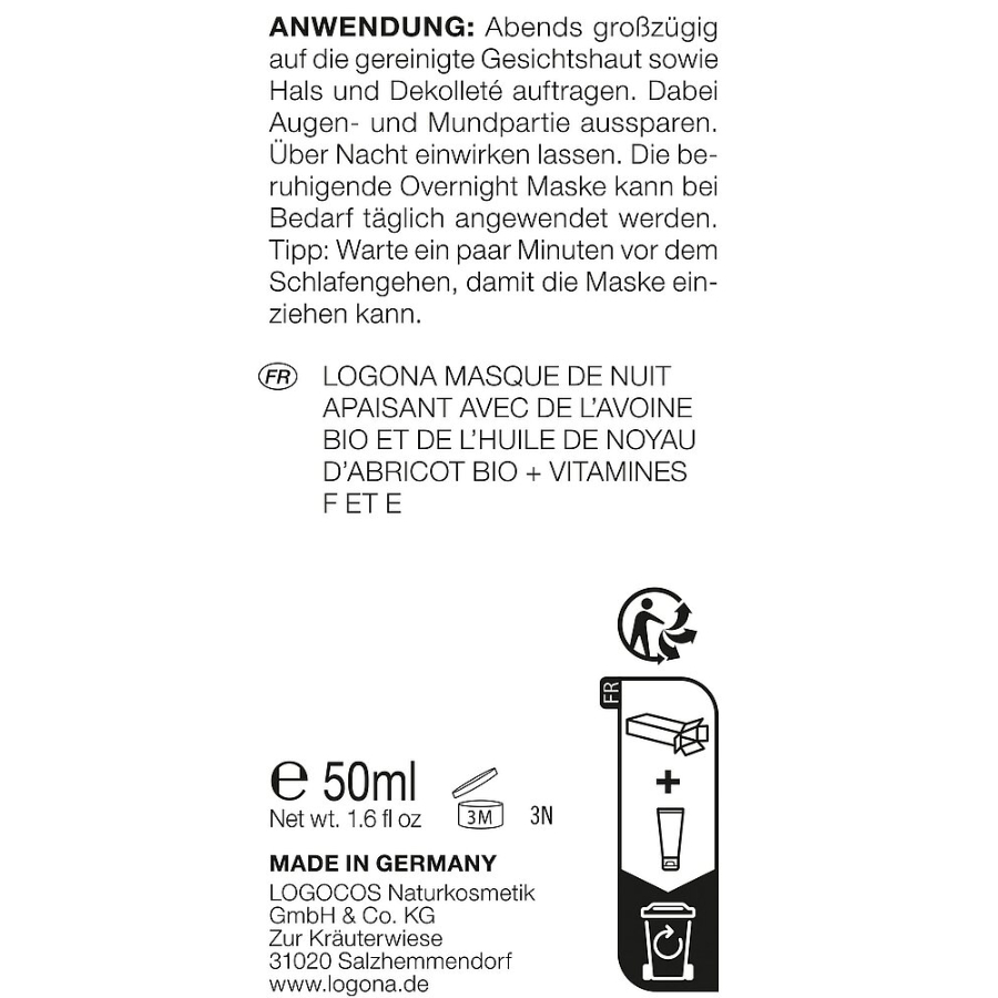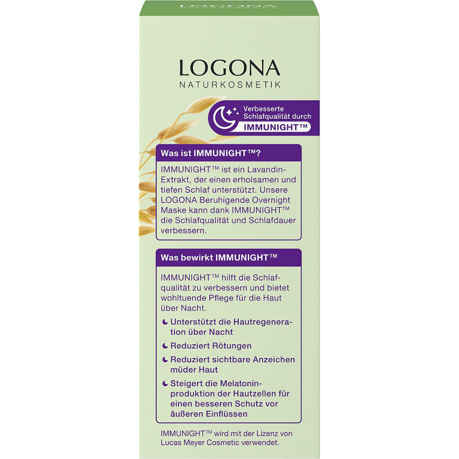 La Mascarilla Vitamínica Calmante Nocturna de con Avena Bio y Vitaminas E y F Logona con Immunight™ nutre y regenera la piel durante la noche, dejándola radiante y fresca a la mañana siguiente. Nutre y suaviza la piel, mejora su elasticidad y firmeza, y restaura su equilibrio. Al mismo tiempo, fortalece la barrera cutánea, haciéndola más resistente a las agresiones externas.