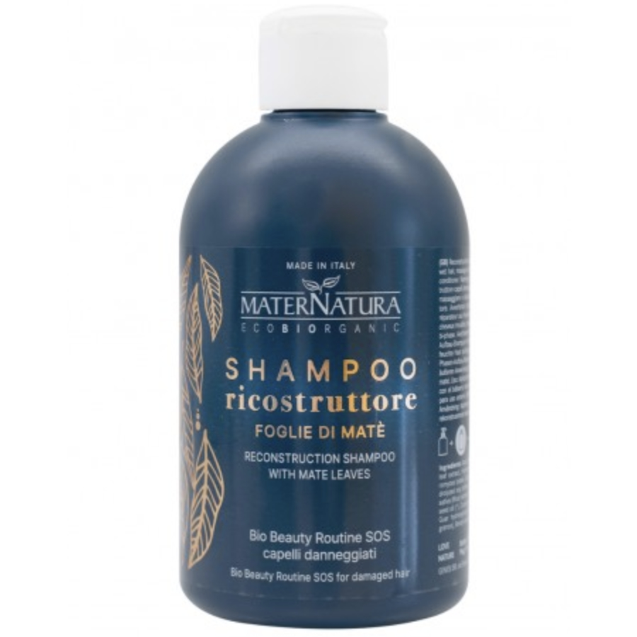 El champú reconstructor Maternatura es un champú reparador y fortalecedor que limpia suavemente eliminando las impurezas que se acumulan en el pelo y dañan su estructura. Aumenta la hidratación, protege el color y mejora el brillo del cabello. Repara el daño provocado por tintes convencionales, tratamientos alisantes y el uso del secador y la plancha. Rico en antioxidantes, revitaliza y restaura la belleza natural del cabello.
