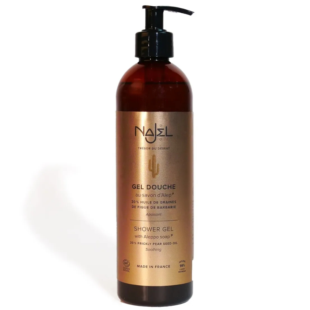 Descubre el gel de ducha Najel enriquecido con aceite de higo chumbo. Combinado con las virtudes ancestrales del jabón de Alepo, este aceite vegetal natural ofrece todos sus beneficios en este gel limpiador para utilizar en la ducha.