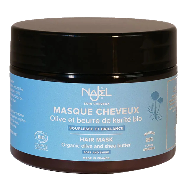 La mascarilla capilar desenredante sin fragancia Najel combina los beneficios de la manteca de karité orgánica, el aceite de oliva orgánico y el aceite de laurel orgánico con agua vegetal orgánica de oliva, un producto reciclado del macizo de Alpilles.