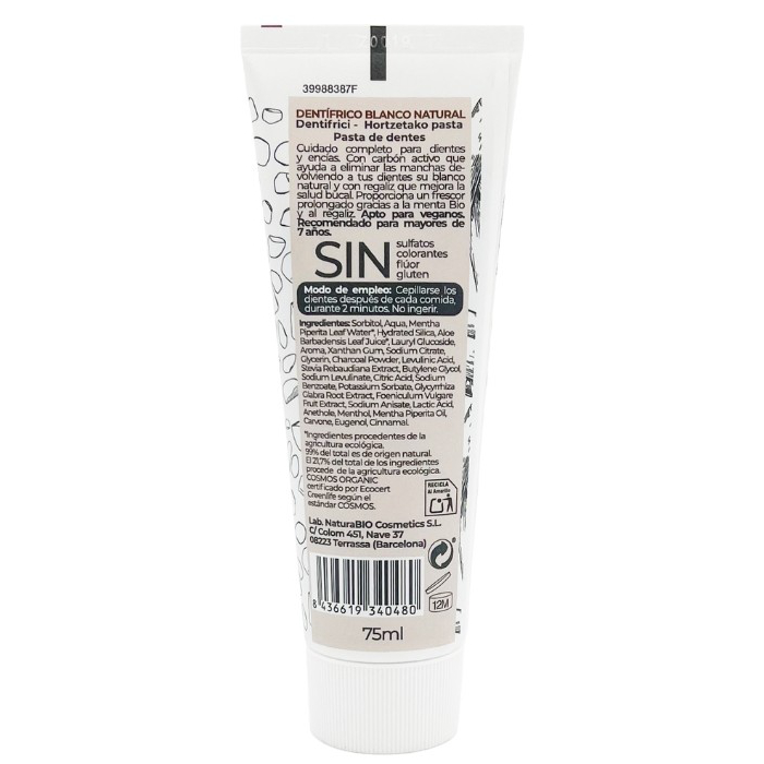 Sorbitol, Aqua, Mentha Piperita (Menta Piperita) Leaf Water*, Hydrated Silica, Aloe Barbadensis (Aloe Vera) Leaf Juice*, Lauryl Glucoside, Xanthan Gum, Sodium Citrate, Glycerin, Charcoal Powder (Carbón), Levulinic Acid, Stevia Rebaudiana (Estevia) Extract, Butylene Glycol, Sodum Levulinate, Citric Acid, Sodium Benzoate, Potassium Sorbate, Glyzhyrriza Glabra (Regaliz) Root Extract, Foeniculum Vulgare (Hinojo) Fruit Extract, Sodium Anisate, Lactic Acid, Anethole Menthol, Mentha Pipperita (Menta Piperita) Oil, Carvone, Eugenol, Cinnamal. *Ingredientes procedentes de la agricultura ecológica.