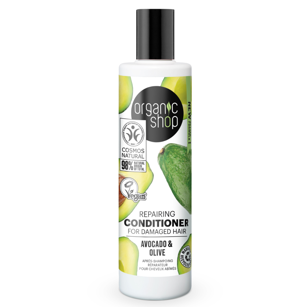 El acondicionador reparador para cabello dañado Organic Shop está formulado con aceite de oliva orgánico y aceite de aguacate orgánico, ricos en vitaminas y minerales, para nutrir, fortalecer y proteger el cabello del daño ambiental.