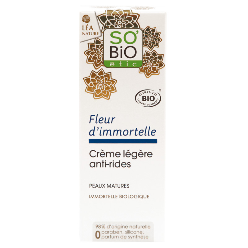 Día tras día, la piel del rostro pierde su firmeza y su tono, se seca y las arrugas se marcan más. Con la crema ligera de día antiarrugas SO'BiO étic, rica en activos naturales y orgánicos, la piel está mejor protegida para minimizar los signos del envejecimiento, recobrará el confort y elasticidad. Las arrugas se reducen.