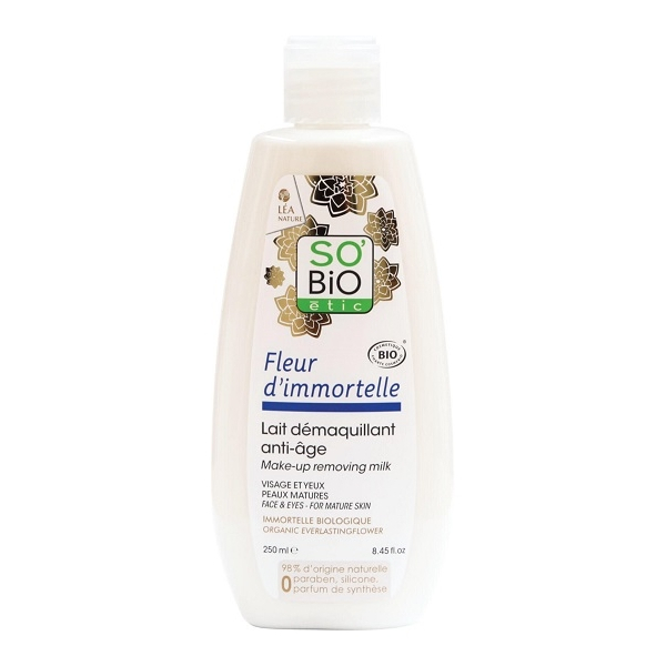 Rica en activos naturales y ecológicos, la leche desmaquillante anti-edad SO'BiO étic limpia, nutre, suaviza y revitaliza la piel gracias a su doble acción de limpieza y tratamiento.