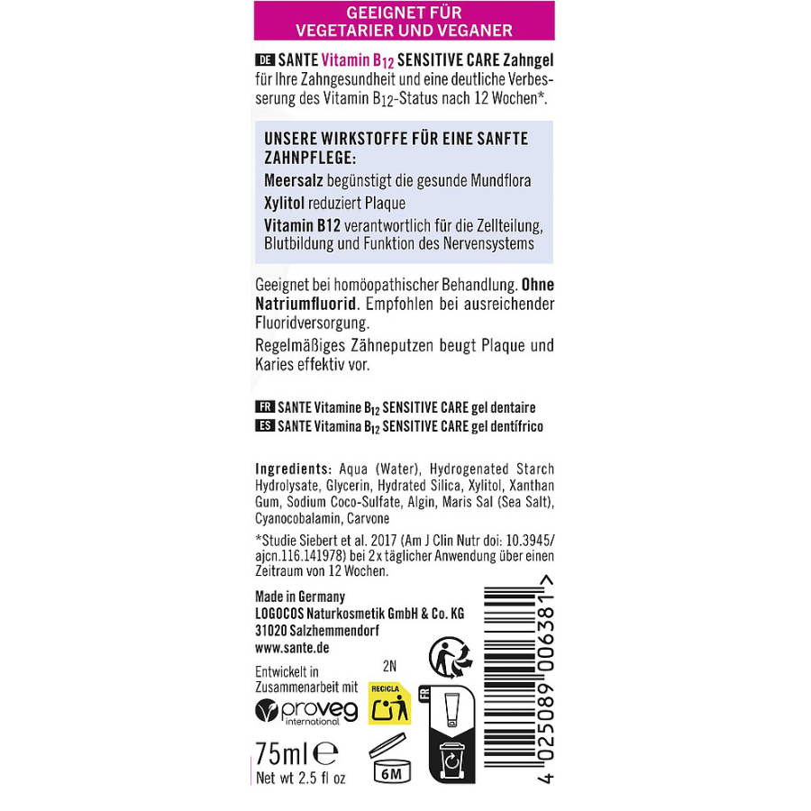 El gel dentífrico SANTE Sensitive Care con Vitamina B12 y sin flúor cuida y protege los dientes y las encías al mismo tiempo. Las partículas naturales de limpieza garantizan la limpieza suave de los dientes y los espacios interdentales.