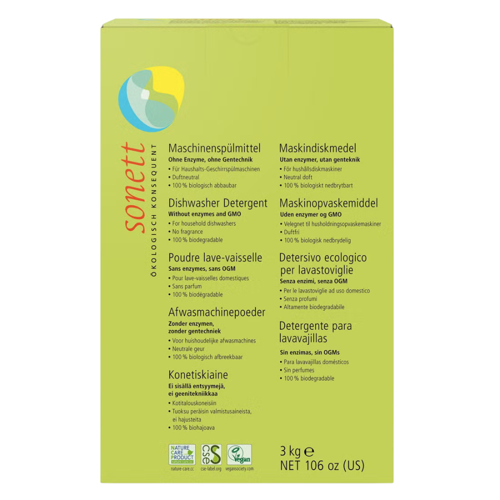 El detergente en polvo para lavavajillas Sonnet está formulado con silicato de sodio, citrato de sodio, percarbonato de sodio, carbonato de sodio y metasilicato de sodio.
