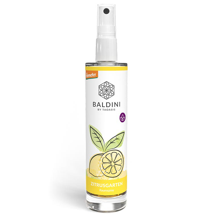 Este aerosol de ambiente orgánico Baldini está elaborado con preciosos aceites esenciales 100 % naturales de pomelo, naranja y limón, y alcohol con calidad Demeter certificada. Contiene limoneno, linalool y acetato de linalilo.
