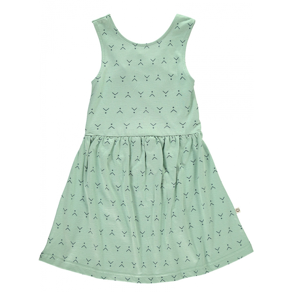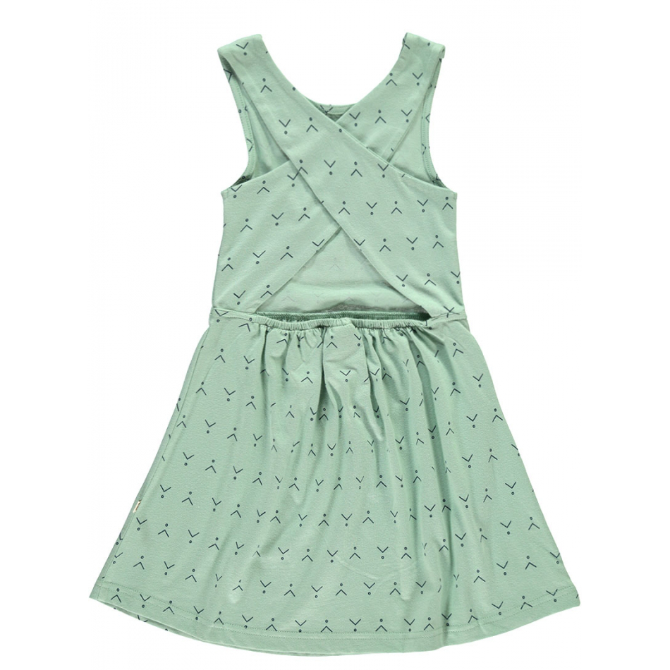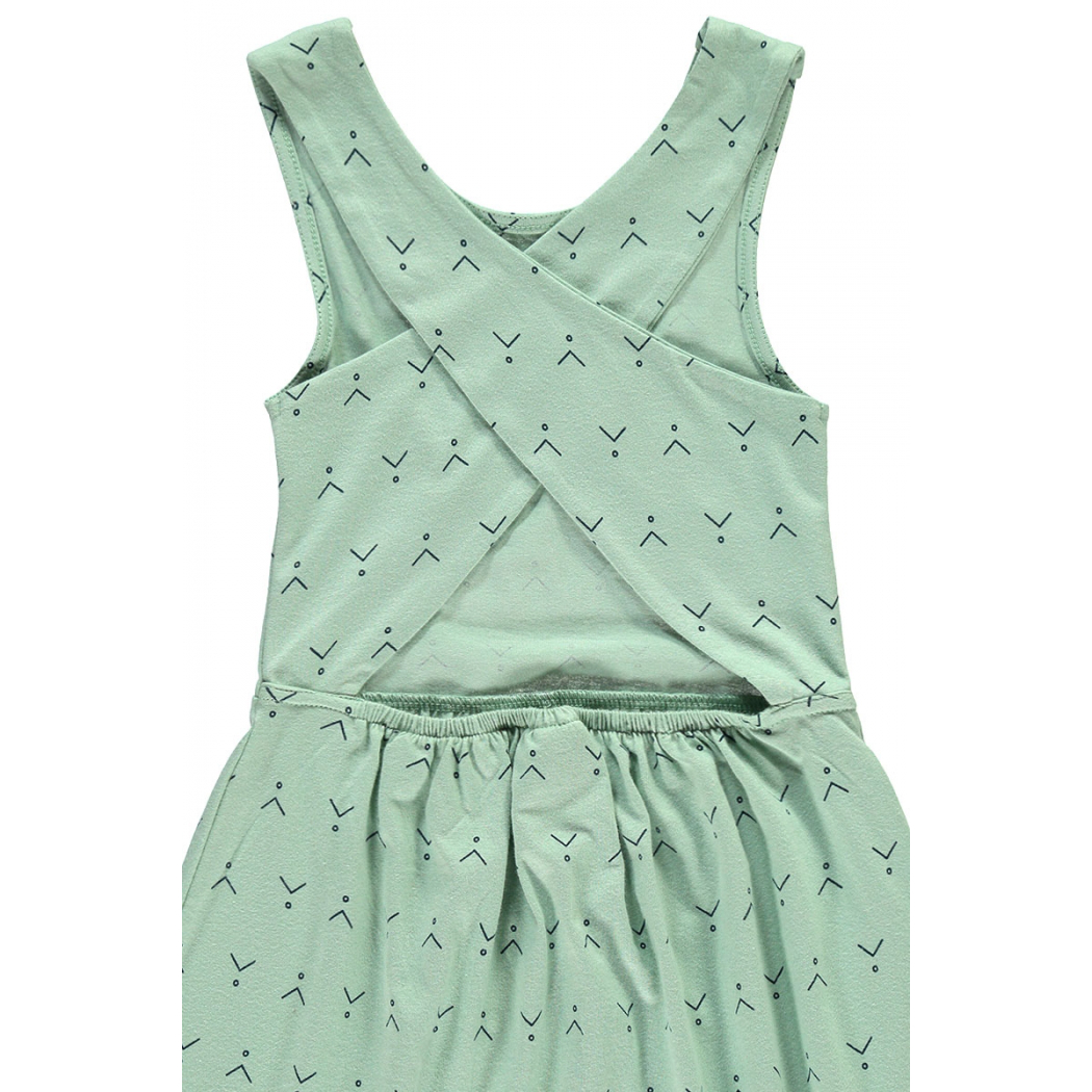 Vestido confeccionado en punto de algodón orgánico con tirantes cruzados en la espalda. Color verde menta con estampado abstracto.