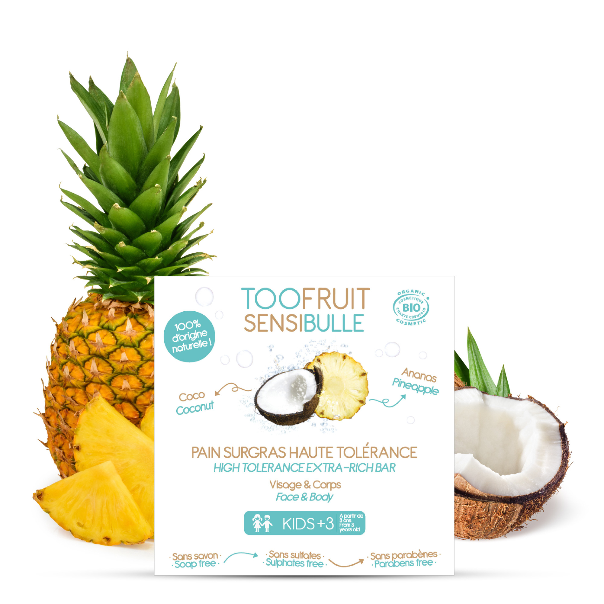 TooFruit Sensibulle Coco + Ananas es un pan dermatológico extra-rico y orgánico de alta tolerancia. Como un jabón sin jabón, limpia suavemente la piel sensible de los niños. Contiene 3 aceites que aportan hidratación y confort a la piel. Aroma exótico de piña y coco.