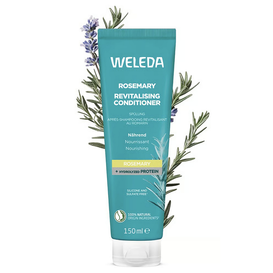 Acondicionador Revitalizante de Romero, una fórmula natural y ligera que desenreda, suaviza y nutre sin apelmazar, manteniendo el volumen natural del cabello. Enriquecido con aceite de romero ecológico, aceites de coco y jojoba, y proteínas vegetales hidrolizadas, mejora la suavidad, el brillo y la facilidad de peinado desde la primera aplicación. Gracias a su textura cremosa y su composición 100 % natural, este acondicionador es ideal para un uso diario y todo tipo de cabellos. Su fórmula sin siliconas ni sulfatos, con tolerancia cutánea dermatológicamente testada, respeta el equilibrio del cuero cabelludo y deja el cabello suelto, suave y con más vida. Un cuidado capilar auténticamente natural.