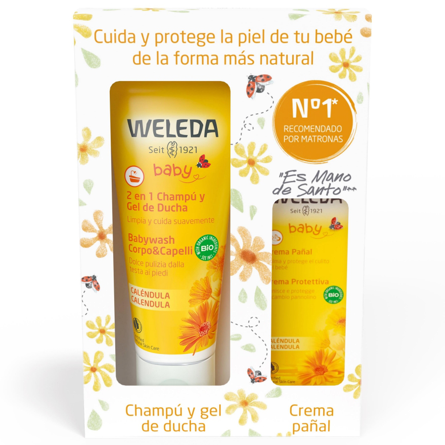 El champú-Gel de ducha de Caléndula Weleda Baby es un básico entre los cuidados del bebé con ingredientes 100% naturales y 53% BIO. Es un gel para baño y ducha sin jabón que limpia suavemente cabello y cuerpo. Su fórmula con valiosos aceites vegetales protege la piel de la sequedad y deja el cabello suave, sedoso y fácil de peinar. Con extractos de Caléndula Bio que calman la piel y no irritan los sensibles ojos de los bebés. Además, su pH neutro lo hace especialmente indicado para bebés y adultos con piel sensible y costra láctea.