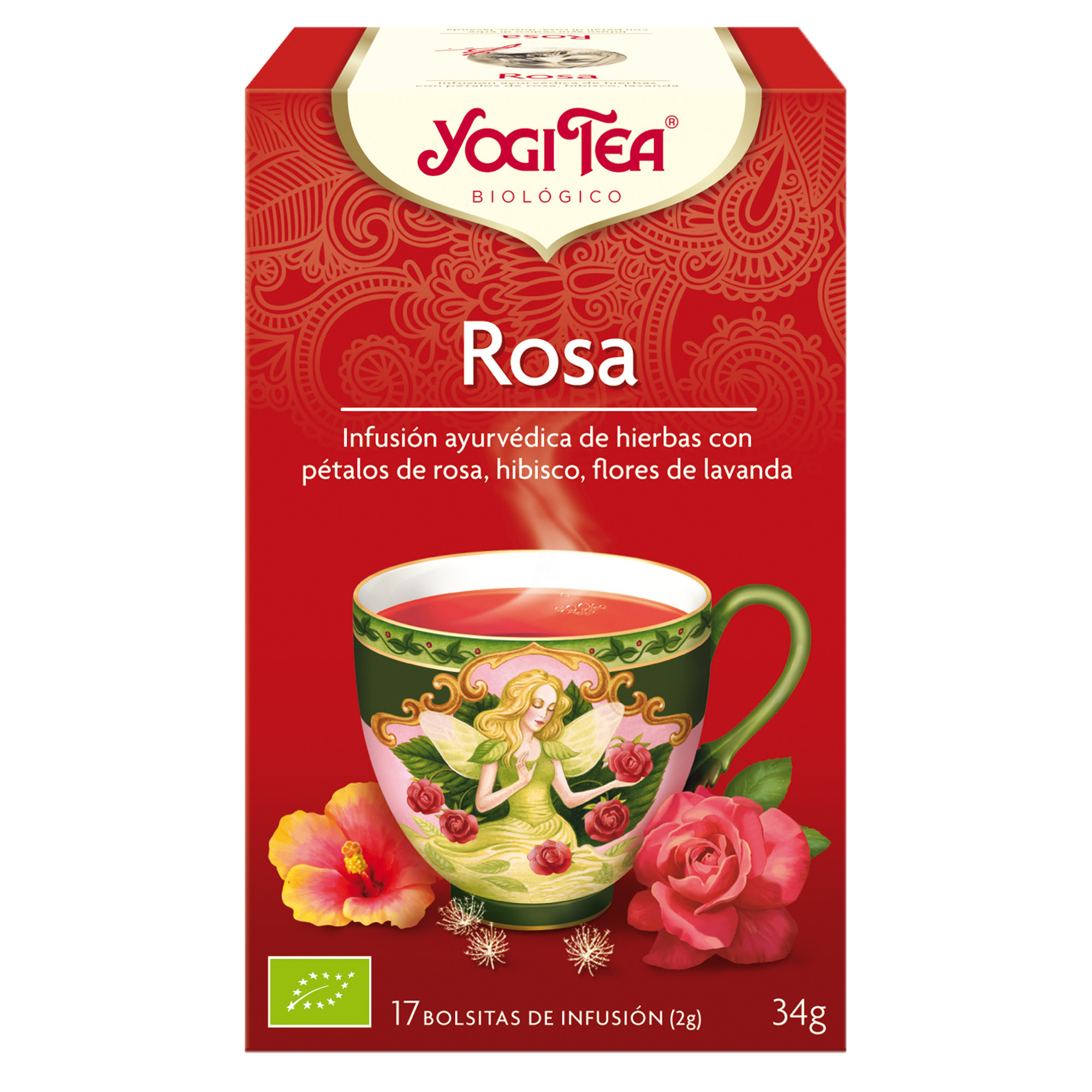 YOGI TEA® Rosa tiene el delicioso aroma floral e irrestible de los pétalos de rosa. Respira el fragante aroma. Después, bebe un sorbo y deja que una deliciosa y suave mezcla floral de camomila, hibisco, flor de saúco y lavanda se apodere de ti. La esencia de esta infusión es: "Mensajero del amor".